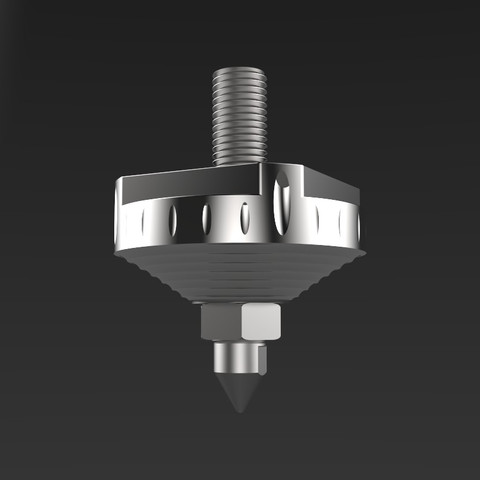 A machined V-Material insert is inset into the robust austenitic stainless-steel diode housing. A stainless-steel post is then threaded into this exclusive V-Material, never touching the diode component. On the bottom of the diode, a spike is threaded into the diode housing, but it does not couple with the V-Material insert. Once the Acoustic Diodes are installed into the loudspeaker, only the V-Material section of the diode comes in contact with the bottom of the loudspeaker.